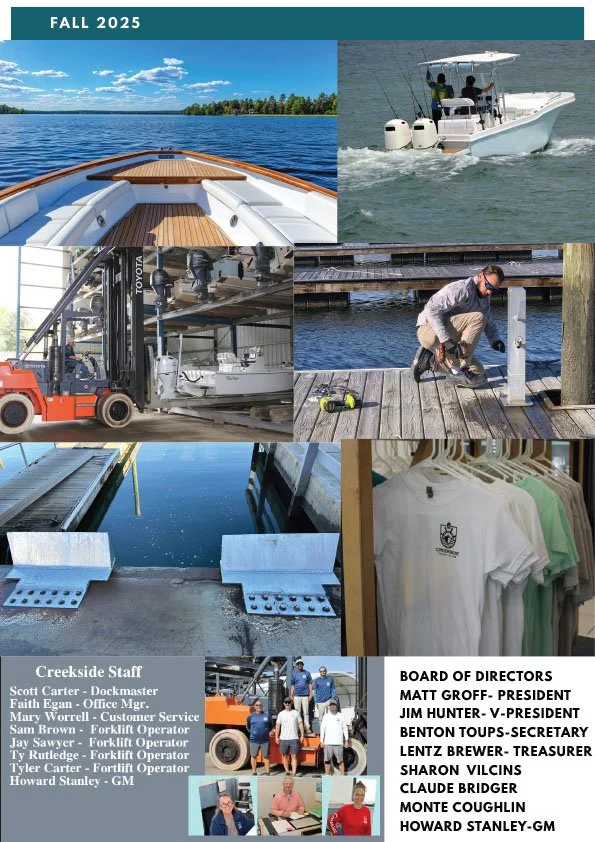 Creekside is not responsible for maintaining, protecting, or preserving boats docked or stored at its facilities. Creekside personnel make periodic checks of the facility but assume no responsibility for boats docked or stored therein. The sole responsibility for boats and their contents and related equipment is that of the Member or Renter that owns the boat.