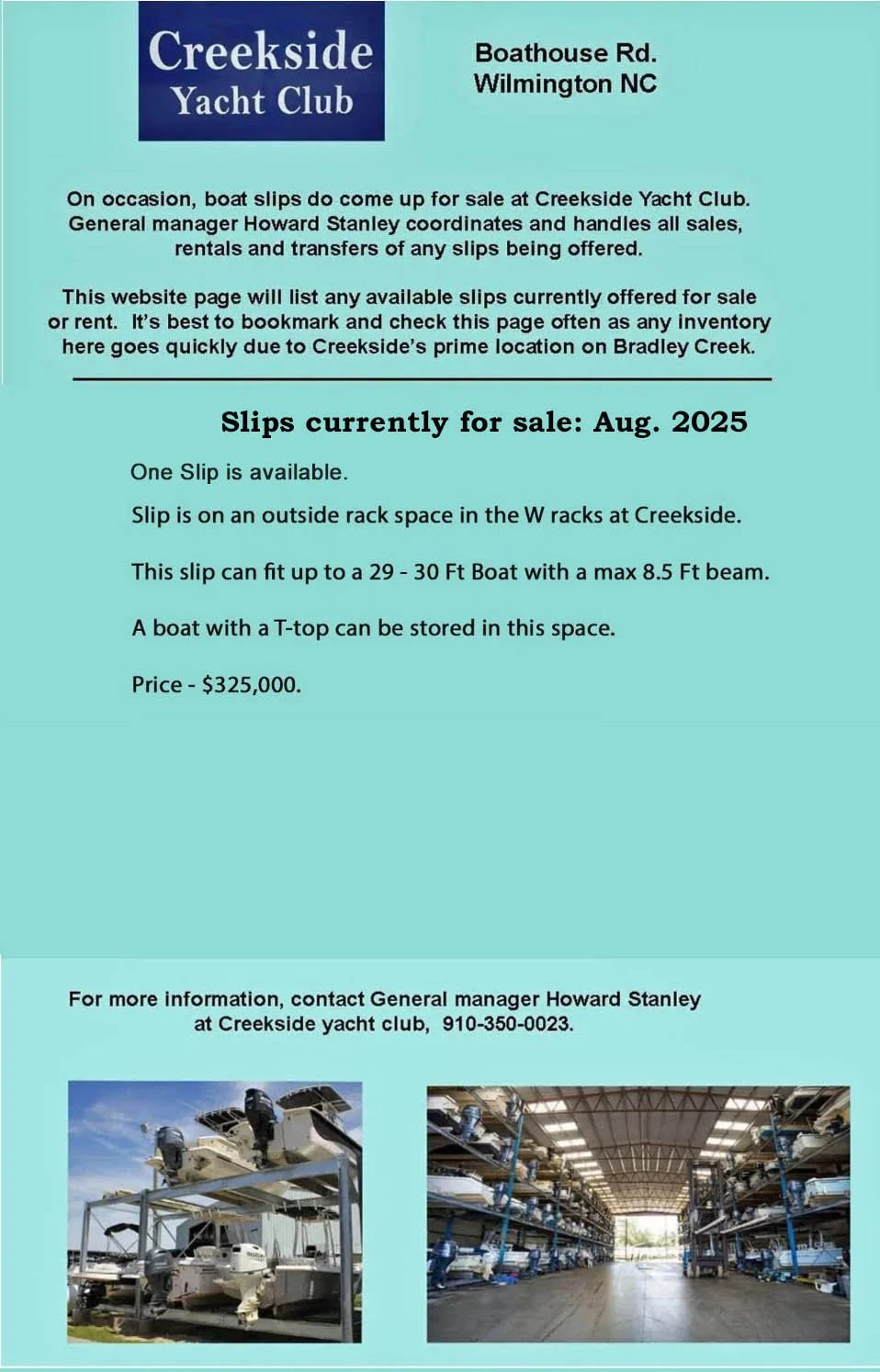 offering privately owned slips that can accommodate vessels up to 30+ feet in length. We have both interior and exterior slips and operate multiple fork lifts to safely transfer vessels to and from the water in a timely matter so your vessel is ready for you when you need it. Dry storage significantly prolongs the life of your vessel by limiting salt water exposure and our operators and staff are experienced, friendly and well trained. We have an active purchase program operated by the manager Howard Stanley and occasionally there are slips available for rent. Call today for more information!